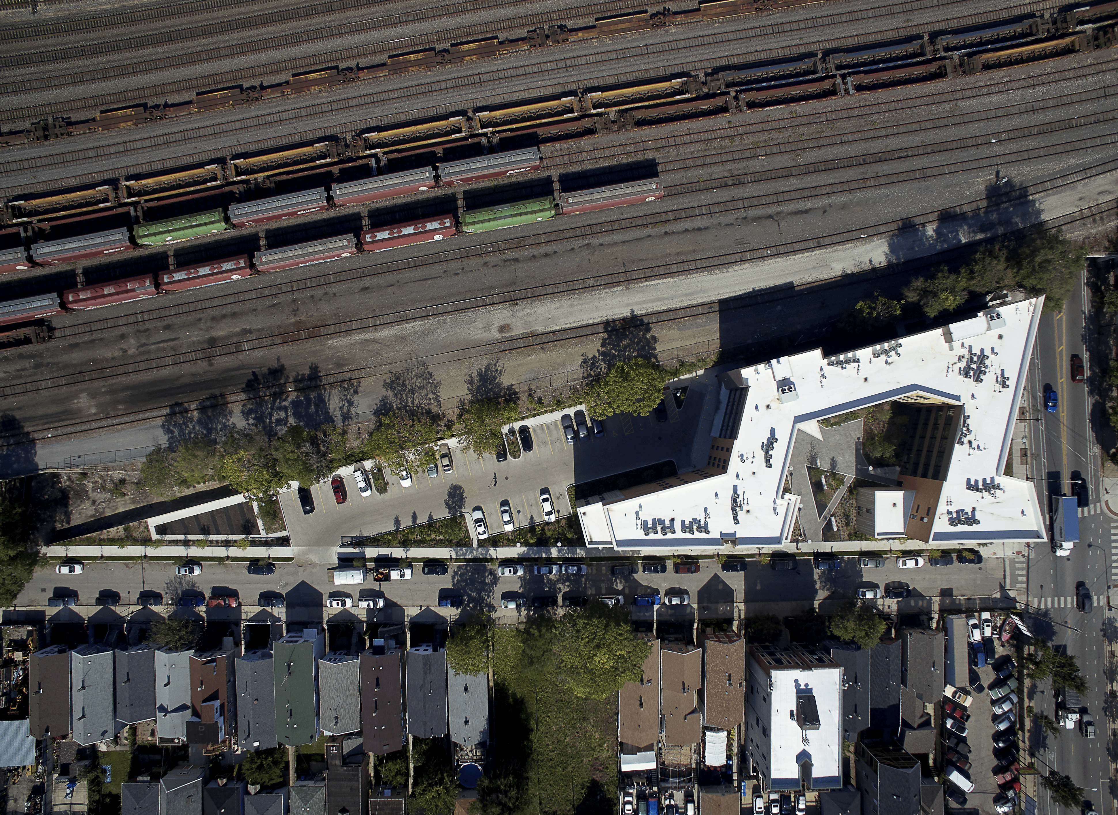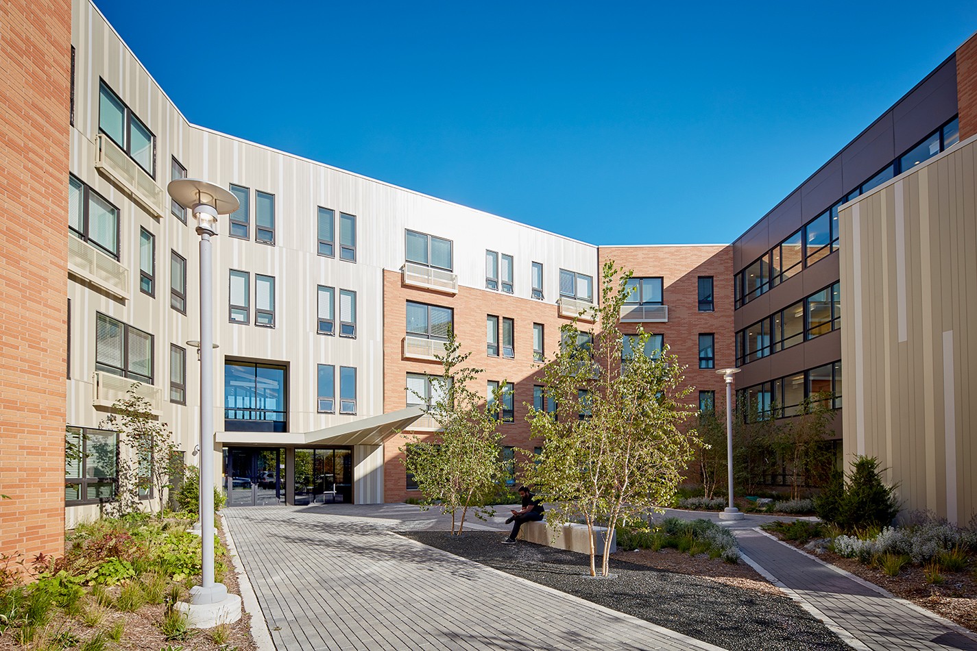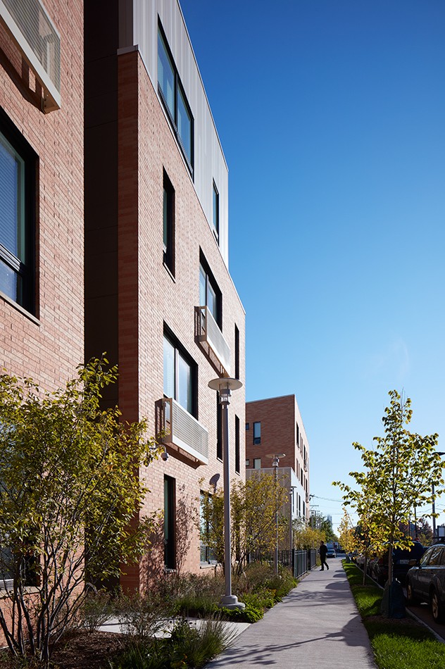 On 17th St, the building regularizes itself to run parallel to the street in order to form a continuous streetscape. Particular attention was paid to the building’s massing and materials; planar material changes and building volumes vary in scale from two to four stories to further relate and echo the scale and materials that make up the housing stock on the opposite side. A single loaded corridor provides an acoustical buffer to the vast rail yard while framing views out to the courtyard visually connecting the residents to the exterior.