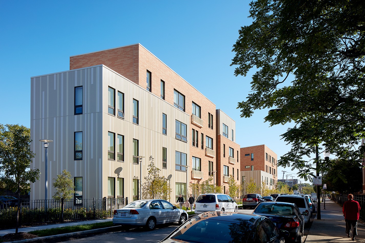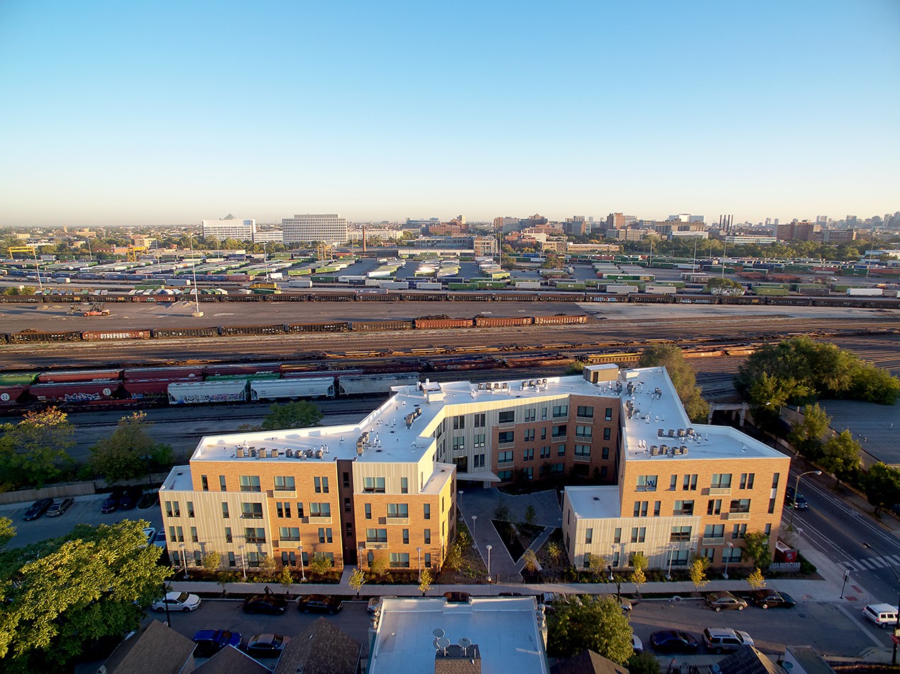 In order to maximize accessibility with 100% visitability, the project was planned as a single building. This form, conceived as a structured ribbon organized to embrace a common courtyard, gestures toward the corner and addresses the scale of each street frontage uniquely. On Damen Ave to the east, where there is less pedestrian activity and heavier traffic, the building is further set back, and angles away from the rail line to the north in order to face units back to the neighborhood and also minimize sound impact from passing trains.