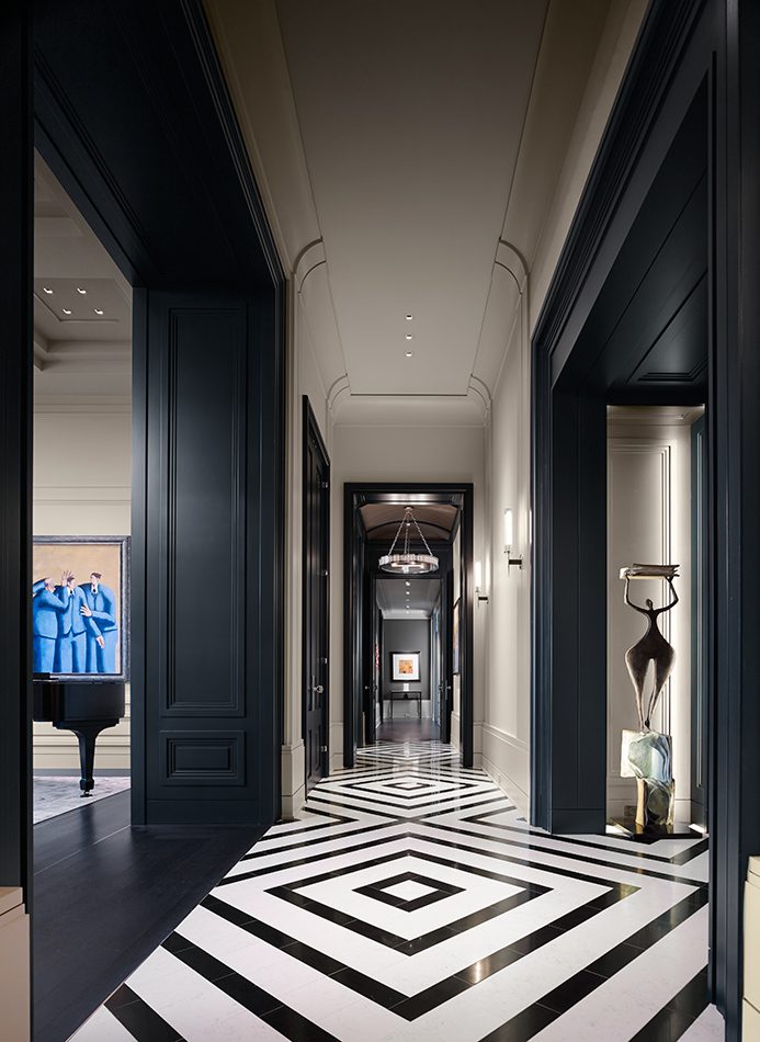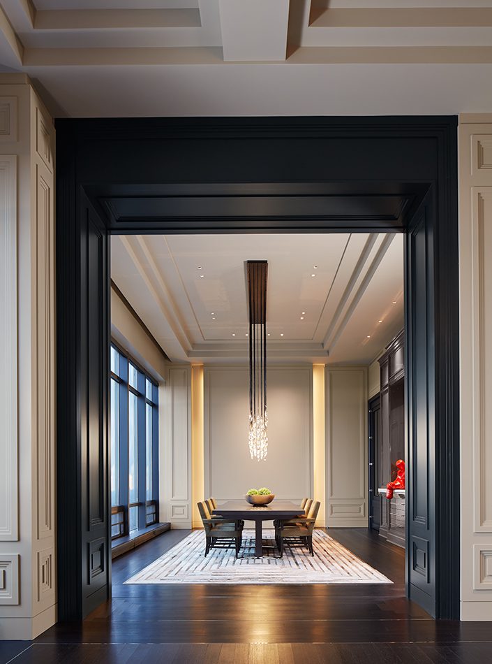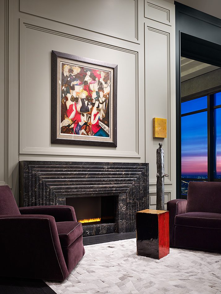 Panelized walls are carefully placed to break down the vertical scale of the space’s volume, while also defining living and art spaces. Black inverted entry portals outline the thresholds between the public rooms. Additional emphasis and drama are generated through the use of a monochromatic palette that speaks to the skyline’s omnipresent silhouettes.