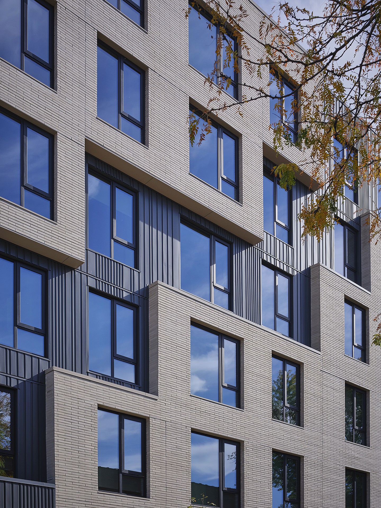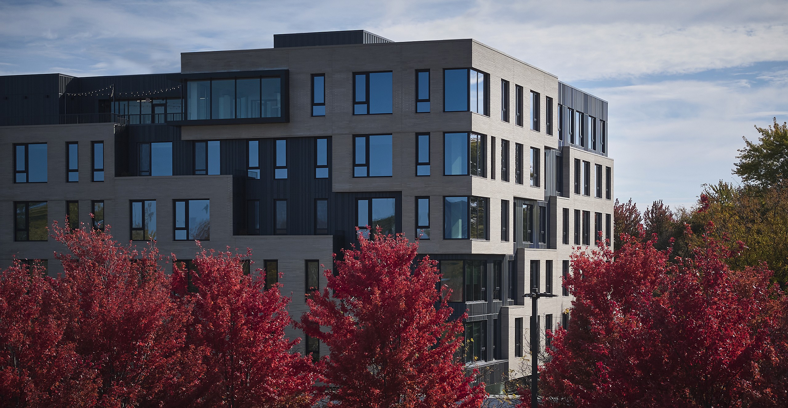 The façade’s informed by the terra cotta craftsmanship of nearby historic landmarks: the historic Goldblatt’s building and the vibrant Rainbow building (AKA the Depositors Bank Building). Familiar materials are reinterpreted through contemporary detailing, establishing continuity with the past while moving forward. A bold architectural gesture—an inset, or “crack,” in the masonry—terraces across the street-facing façades and meets at the corner, establishing a visual connection from the street’s public realm below to the building’s one above.