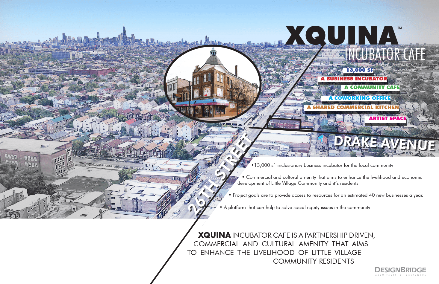 Xquina Incubator & Cafe is a partnership-driven, commercial and cultural amenity aiming to enhance the livelihood of Little Village residents. Public and private capital will be invested to redevelop approximately 13,000 SF of commercial retail including a business incubator, co-working office, local cafe, and shared commercial kitchen.